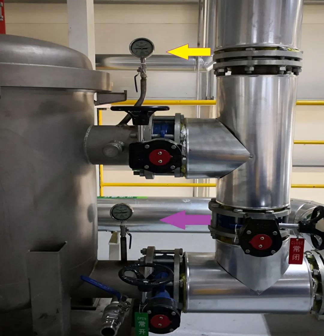 • 检查设备进口(黄色箭头)压力表和出口(紫色箭头)压力表的压差区间在0.5~1公斤,准备更换过滤袋。