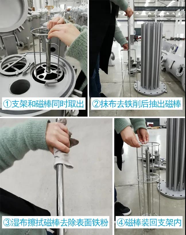 过滤设备内配置了磁棒时,可按如下步骤进行清洁,在更换滤袋过程中连同支架一起放入过滤设备的过滤袋内即可。