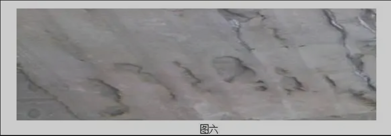 滤袋长803.cm,折径为:20.08cm;新滤袋长度为811.0-813.5cm,折径为:20.1-20.3 cm,即滤袋纵向热缩率为:0.91-1.22%,横向热缩率为:0.10-1.08%。整条滤袋破损严重,尤其是滤袋上半段。整条滤袋存在多处由内向外磨损大小不一的破洞,破洞处边沿可见基布;在袋笼横筋处也存在由内向外磨损的破洞。滤袋多处表面纤维层被磨损,可见基布;净气面存在纤维层脱落、纵向裂开。(见图三、四)