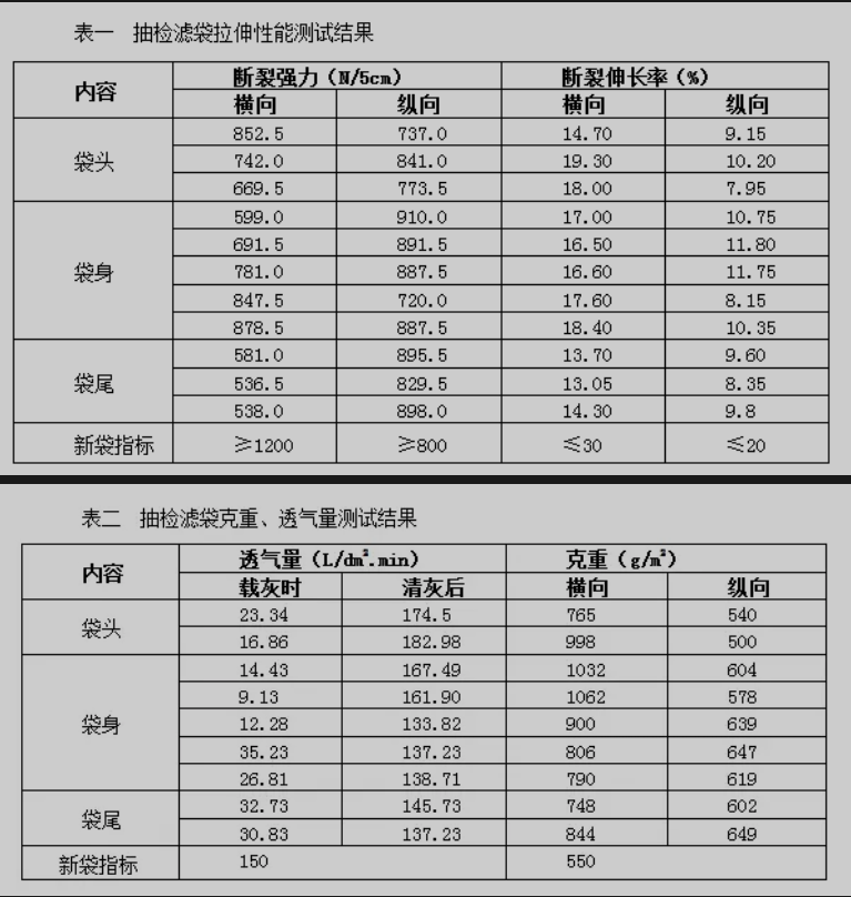 表一、表二为抽检滤袋的常规性能测试结果。抽检滤袋横向强力明显下降,尤其袋尾段;清灰后,局部透气气量偏大,归因于滤袋局部纤维层被磨损裸露基布;克重偏大,归因于滤料表面仍粘结粉尘。